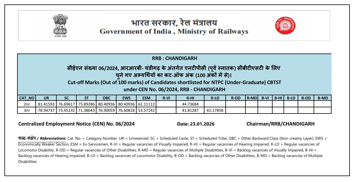 | Commercial cum Ticket Clerk | 2022 | 10+2 (Intermediate) Exam passed from any recognized board in India. (General/OBC/EWS: 50% Marks Required; SC/ST/PH: Only Passing Marks) | |||||||